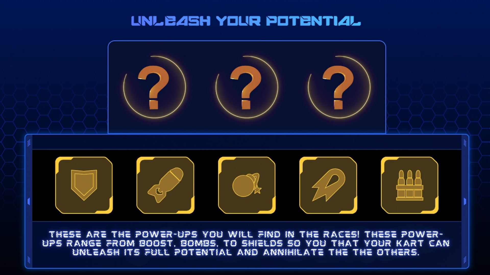 In CyberKart races, you'll encounter hovering power-ups marked with question marks on the track. Driving through these grants you random abilities to enhance your race strategy.